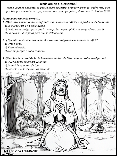 🙏Oración modelo. Querido Dios, Gracias por este tiempo juntos hoy. Te pedimos que nos ayudes a recordar lo que aprendimos y a ponerlo en práctica en nuestras vidas. Ayúdanos a ser valientes y buscar ayuda cuando lo necesitemos, como Jesús buscó a sus amigos. También ayúdanos a aceptar las cosas difíciles que enfrentemos, sabiendo que siempre estás con nosotros. Bendice a cada uno de nosotros y a nuestras familias. Amén."